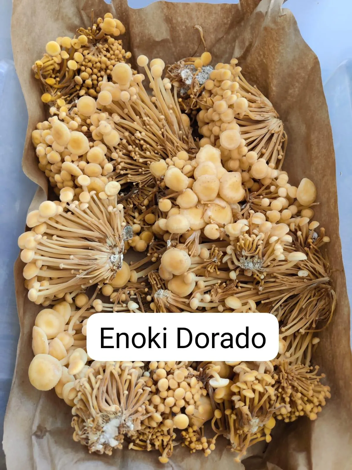 Pequeños, de tallo largo y color marrón anaranjado, conocidos por su textura crujiente, sabor afrutado suave y color vibrante. A diferencia de los enokis blancos que crecen en la oscuridad, estos se cultivan con exposición a la luz. Son populares en la cocina asiática, especialmente en sopas, stir fries y hot pots.